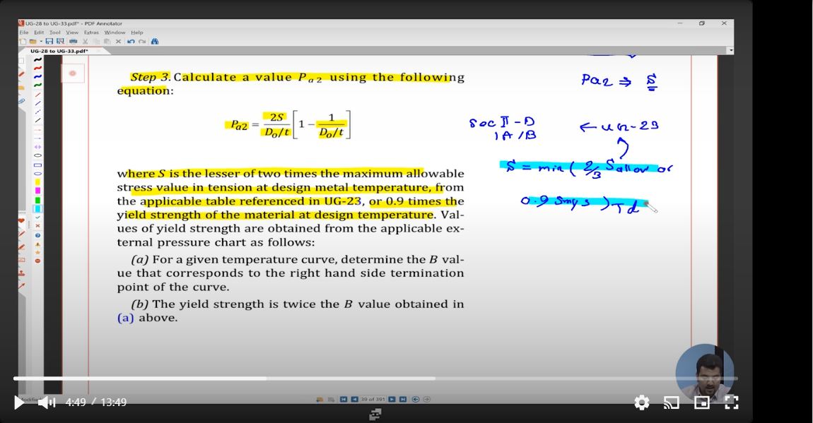 در توضیحات مربوط به بند UG-28 و محاسبه ضخامت پوسته های ضخیم استاد فرمودند که حداق میزان S از فرمول زیر بدست می آید