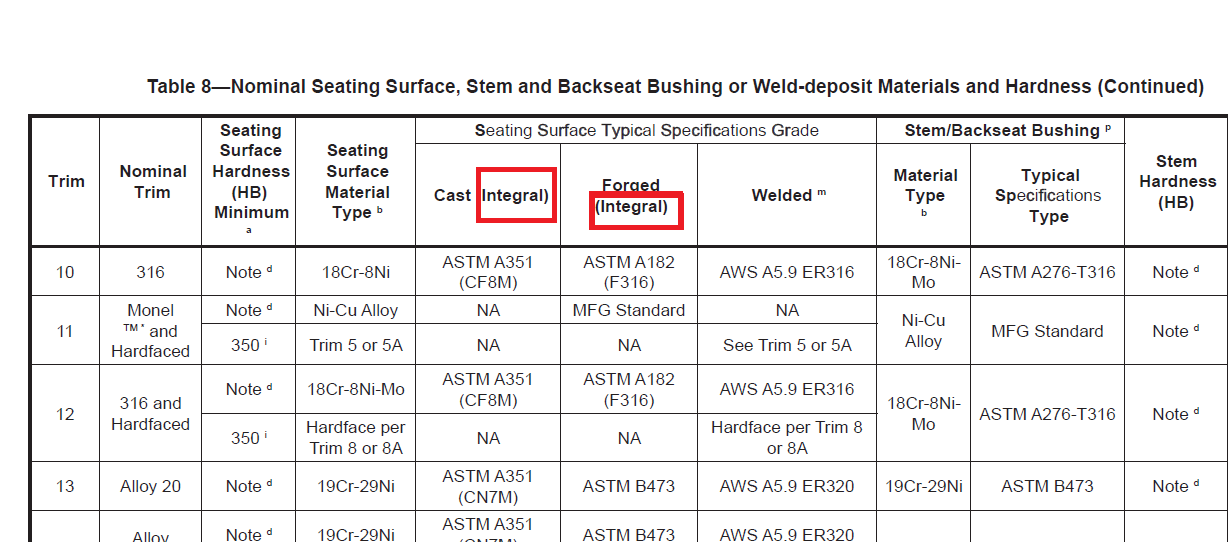ایا منظور از عنوان “Forge (Integral)” در ستون جدول تریم، بدین معناست که، متریال تریم A182 تنها میتواند به روش Forge بر روی “Integral Seat” ها و نه Renewable Seat قرار گیرد؟