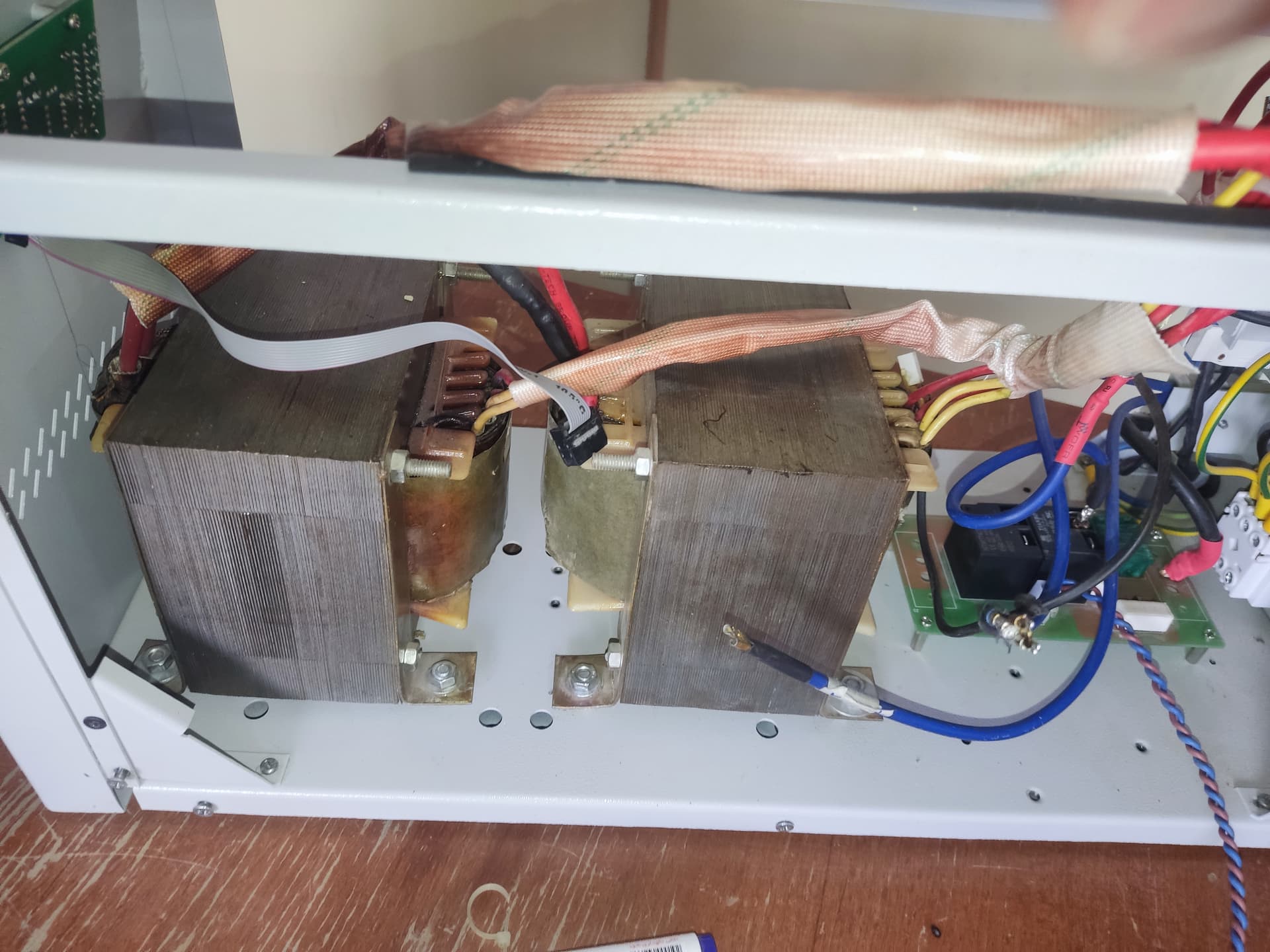 ۲ـ استاد این دستگاه دو تا ترانس عیناً شبیه به هم دارد(داخل تصویر زیر مشخص است) و حتی یکی از سیم های ضخیم آن به هم متصل شده است، آیا این دو ترانس هم کار باک ـ بوست انجام میدهد و هم پوش ـ پول؟